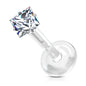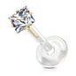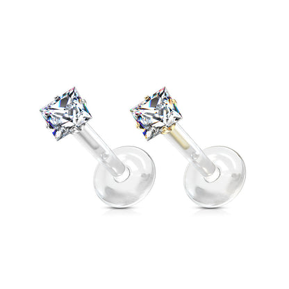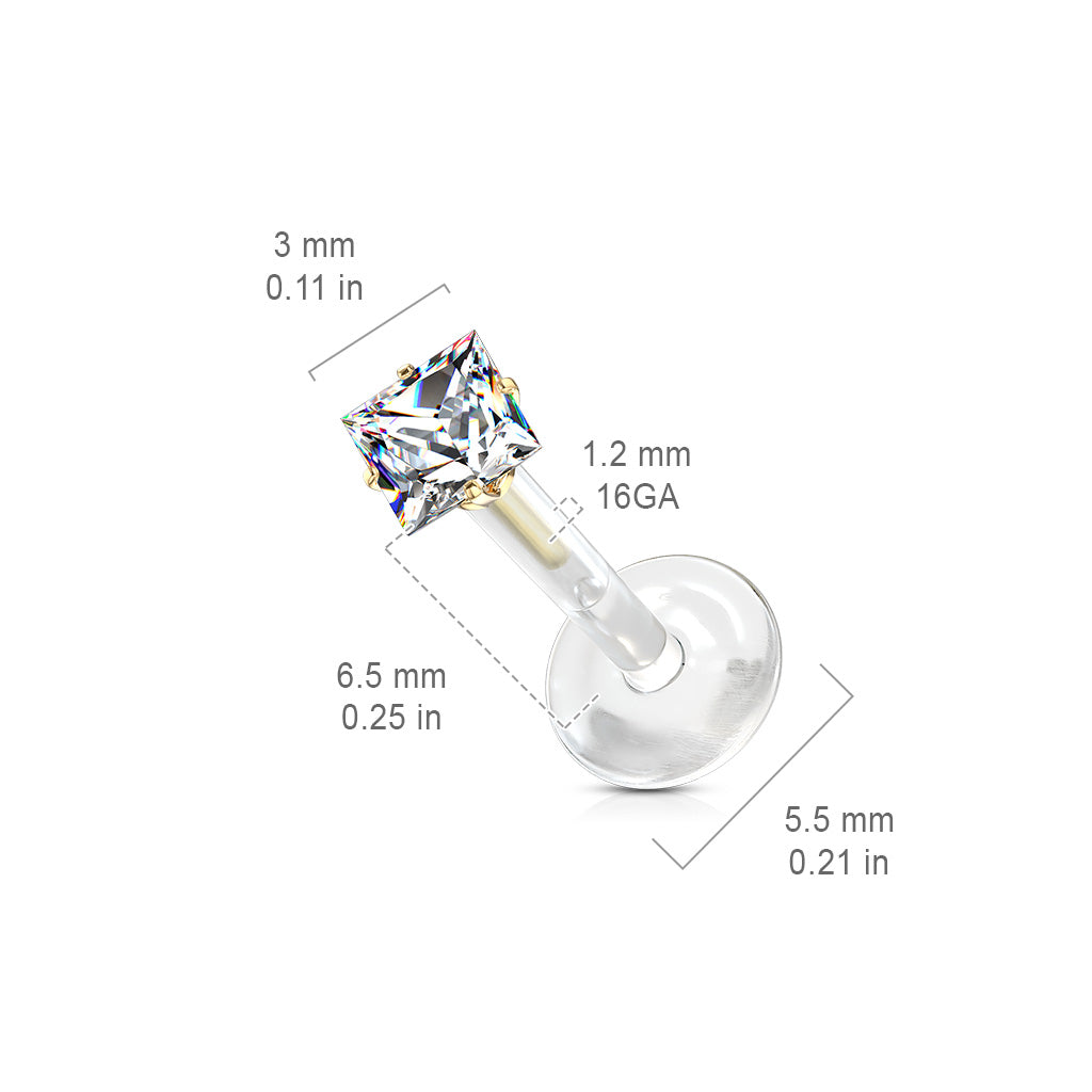 This plastic labret has a 2 or 3mm square surgical steel prong clasp cubic Zirconia pushpin top. Available only in 16G but with a 6mm or 8mm post length. The surgical steel prong clasp tops are available in steel with crystal or yellow gold plated prong with crystal.