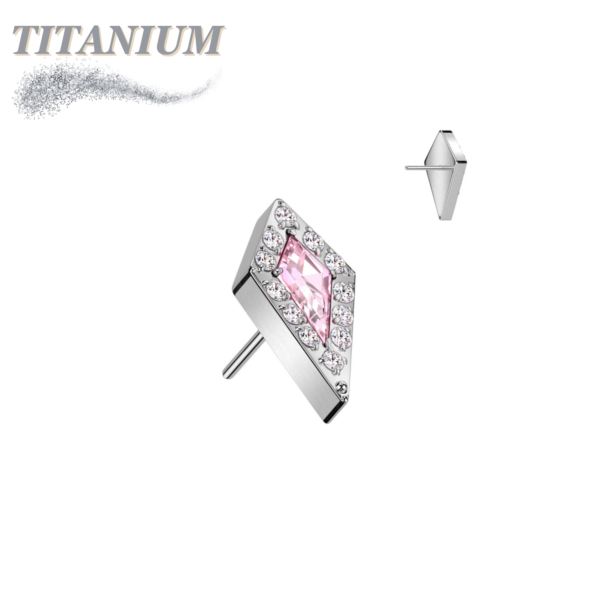 Threadless titanium top in a stiletto style triangle with paved cz outer lining with a solid colored middle cz feature color. Over all length 8.8mm. Fits all our threadless posts. Sold by each.