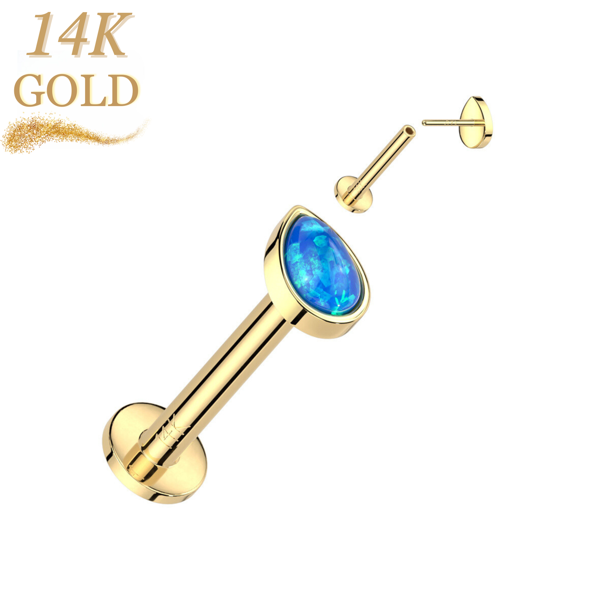 Made from 14kt gold, these threadless labrets have a standard post with 3mm disc and feature a 3.7mm pear shaped synthetic opal push in top. 16G 8mm only.