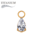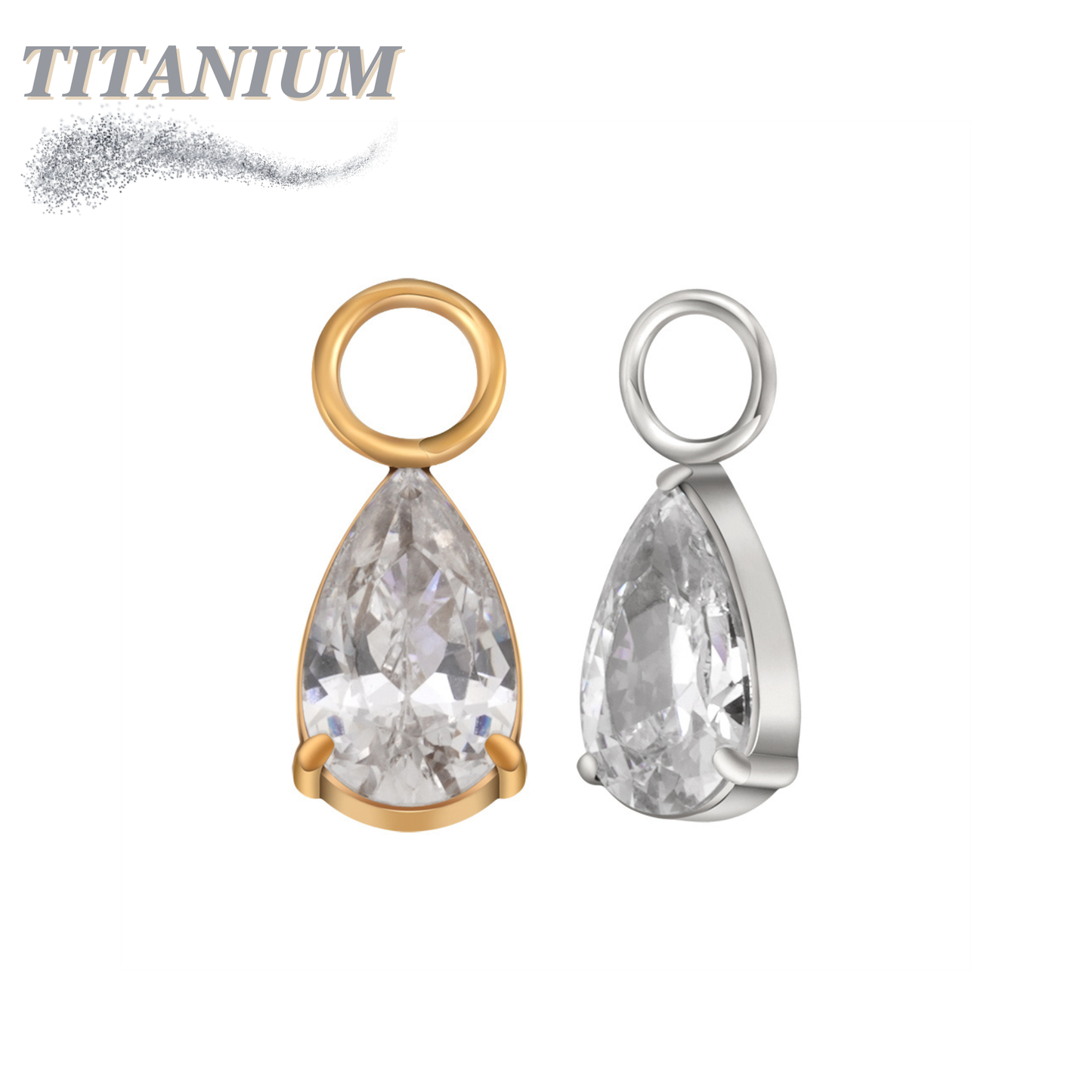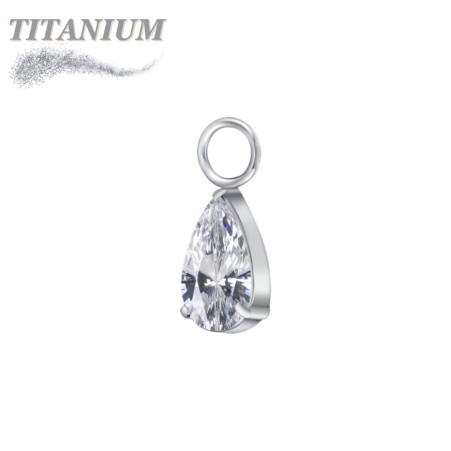 These waterdrop charms are 5mm long and have a 2mm opening are made from ASTM F -136 titanium. Please note the connector chains also have 2mm round ends so you can not place the chain end through the charm. However, rings and studs can accommodate the charm.